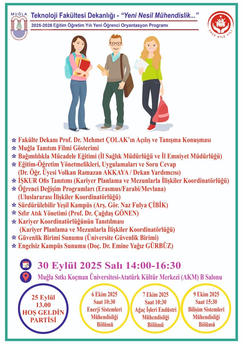 Yeni Öğrenci Oryantasyon Programı Bölümümüze 2025-2026 Eğitim-Öğretim Yılı'nda başlayan öğrencilerimizin dikkatine; 30 Eylül 2025 Salı günü Atatürk Kültür Merkezi B Salonu'nda Teknoloji Fakültesi Dekanlığı tarafından oryantasyon etkinliği düzenlenecektir. 30.09.2025